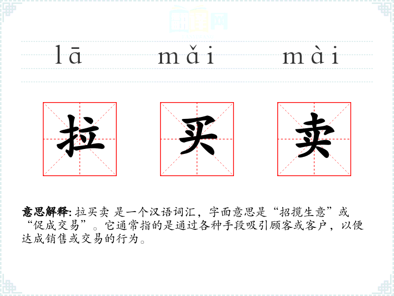 拉买卖 是一个汉语词汇,字面意思是“招揽生意”或“促成交易”。它通常指的是通过各种手段吸引顾客或客户,以便达成销售或交易的行为。