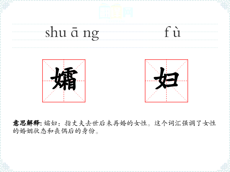 孀妇:指丈夫去世后未再婚的女性。这个词汇强调了女性的婚姻状态和丧偶后的身份。