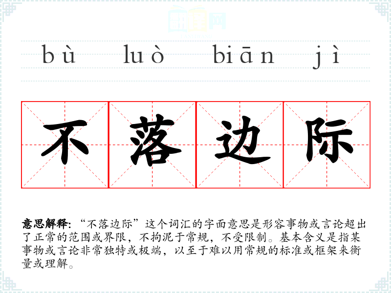 “不落边际”这个词汇的字面意思是形容事物或言论超出了正常的范围或界限,不拘泥于常规,不受限制。基本含义是指某事物或言论非常独特或极端,以至于难以用常规的标准或框架来衡量或理解。