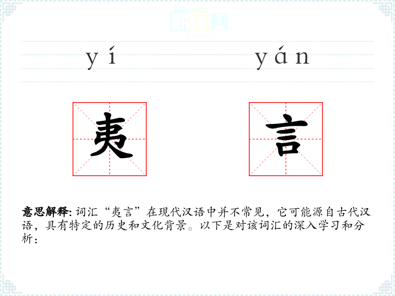 词汇“夷言”在现代汉语中并不常见,它可能源自古代汉语,具有特定的历史和文化背景。以下是对该词汇的深入学*和分析: