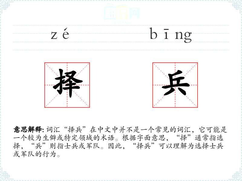 词汇“择兵”在中文中并不是一个常见的词汇,它可能是一个较为生僻或特定领域的术语。根据字面意思,“择”通常指选择,“兵”则指士兵或军队。因此,“择兵”可以理解为选择士兵或军队的行为。