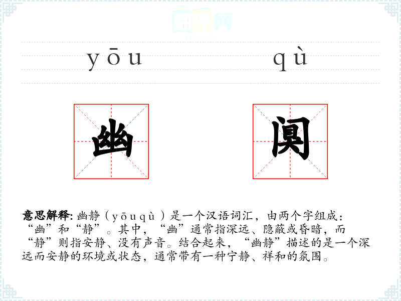幽静(yōu qù)是一个汉语词汇,由两个字组成:“幽”和“静”。其中,“幽”通常指深远、隐蔽或昏暗,而“静”则指安静、没有声音。结合起来,“幽静”描述的是一个深远而安静的环境或状态,通常带有一种宁静、祥和的氛围。