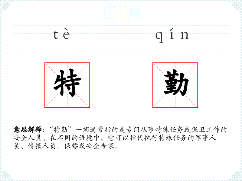 “特勤”一词通常指的是专门从事特殊任务或保卫工作的安全人员。在不同的语境中,它可以指代执行特殊任务的军事人员、情报人员、保镖或安全专家。