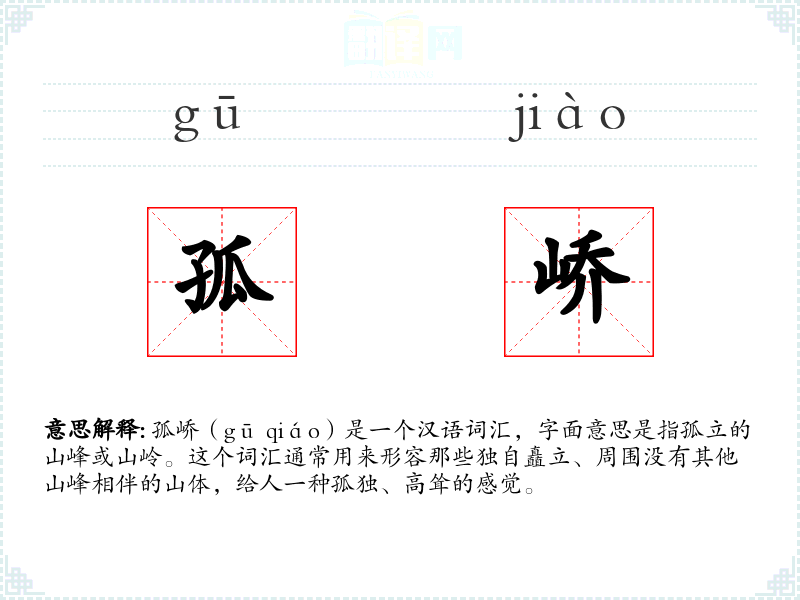 孤峤(gū qiáo)是一个汉语词汇,字面意思是指孤立的山峰或山岭。这个词汇通常用来形容那些独自矗立、周围没有其他山峰相伴的山体,给人一种孤独、高耸的感觉。
