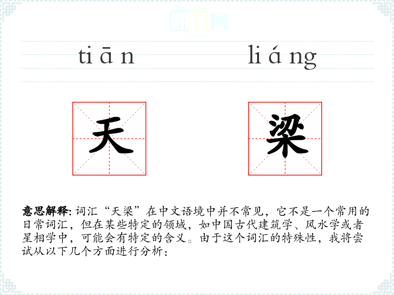 词汇“天梁”在中文语境中并不常见,它不是一个常用的日常词汇,但在某些特定的领域,如**古代建筑学、风水学或者星相学中,可能会有特定的含义。由于这个词汇的特殊性,我将尝试从以下几个方面进行分析:
