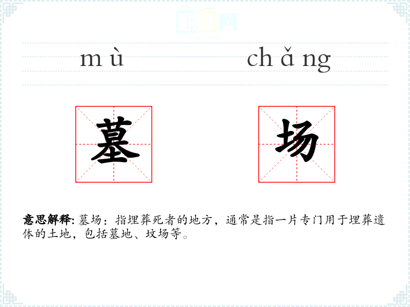 - 词源:“墓场”一词源于古汉语,由“墓”和“场”组成,意指埋葬死者的场所。
