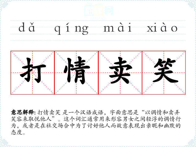 打情卖笑 是一个汉语成语,字面意思是“以调情和卖弄笑容来取悦他人”。这个词汇通常用来形容男女之间轻浮的调情行为,或者是在社交场合中为了讨好他人而故意表现出亲昵和幽默的态度。