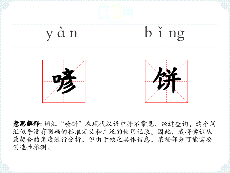 词汇“喭饼”在现代汉语中并不常见,经过查询,这个词汇似乎没有明确的标准定义和广泛的使用记录。因此,我将尝试从最契合的角度进行分析,但由于缺乏具体信息,某些部分可能需要创造性推测。