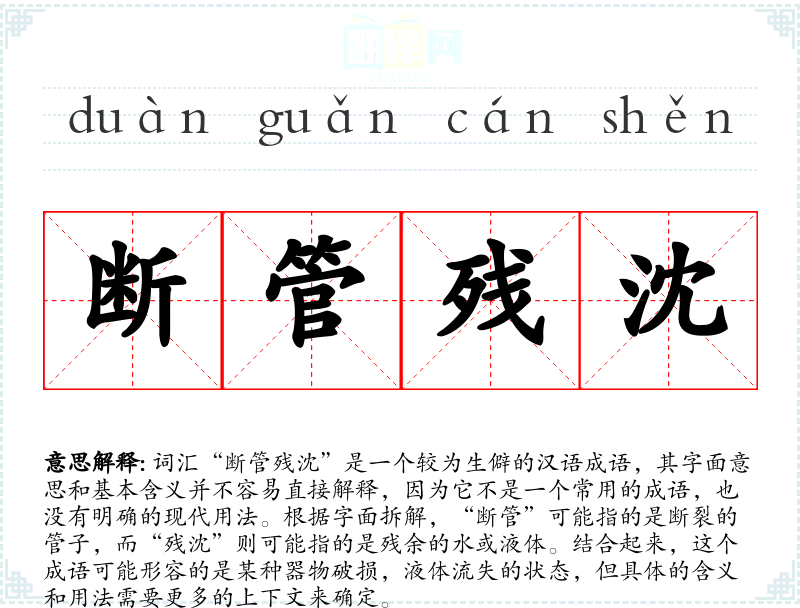 词源与演变方面,由于“断管残沈”不是一个常见的成语,其词源和历史演变的信息非常有限。可能需要查阅古籍或专业的汉语词源学资料才能找到更多信息。