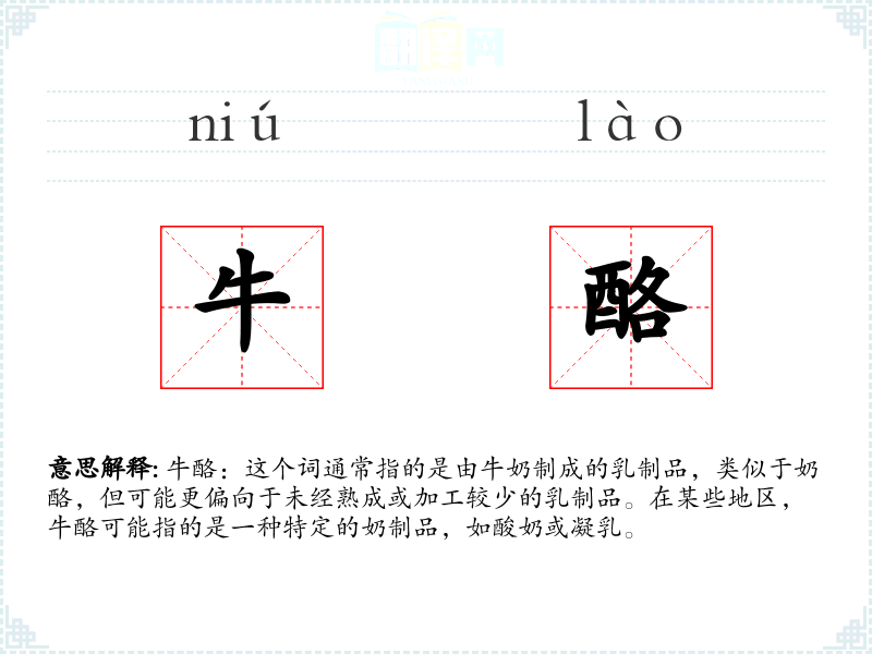 牛酪:这个词通常指的是由牛奶制成的乳制品,类似于奶酪,但可能更偏向于未经熟成或加工较少的乳制品。在某些地区,牛酪可能指的是一种特定的奶制品,如酸奶或凝乳。