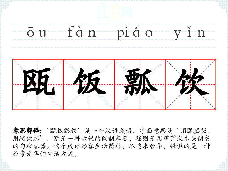 “瓯饭瓢饮”这个成语的词源较为模糊,但它反映了**古代文人对简朴生活的向往和推崇。随着时间的推移,这个成语的使用逐渐固定下来,成为描述简朴生活的常用语。
