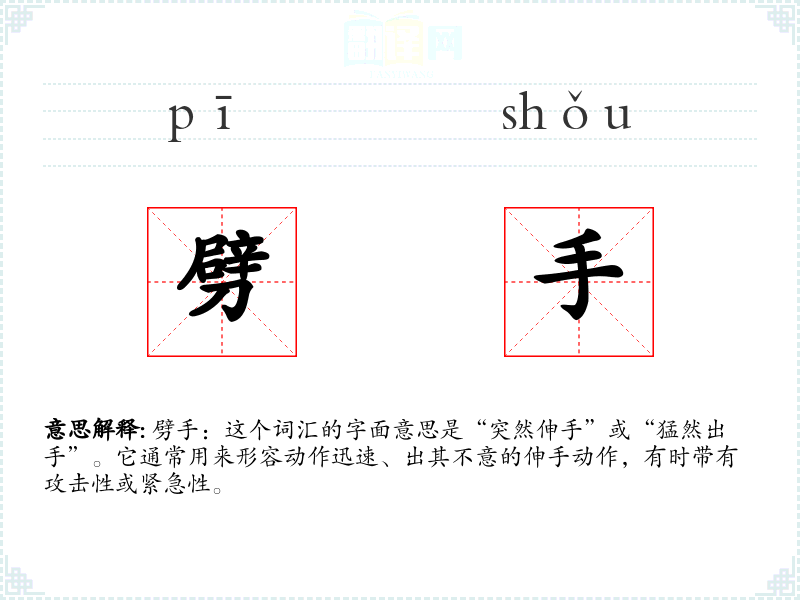 劈手:这个词汇的字面意思是“突然伸手”或“猛然出手”。它通常用来形容动作迅速、出其不意的伸手动作,有时带有攻击性或紧急性。