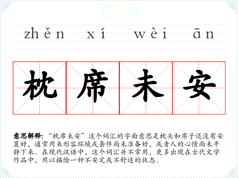 “枕席未安”这个词汇的字面意思是枕头和席子还没有安置好,通常用来形容环境或条件尚未准备好,或者人的心情尚未平静下来。在现代汉语中,这个词汇并不常用,更多出现在古代文学作品中,用以描绘一种不安定或不舒适的状态。