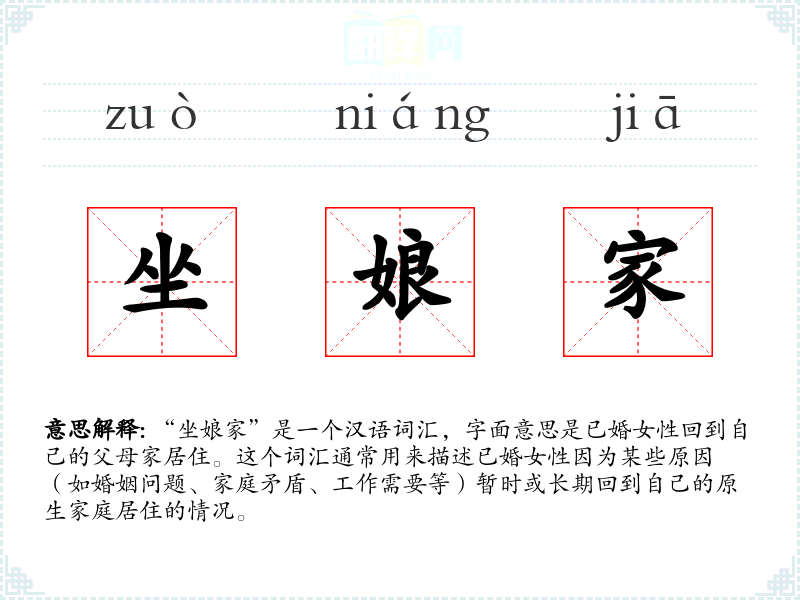 “坐娘家”是一个汉语词汇,字面意思是已婚女性回到自己的父母家居住。这个词汇通常用来描述已婚女性因为某些原因(如婚姻问题、家庭矛盾、工作需要等)暂时或长期回到自己的原生家庭居住的情况。