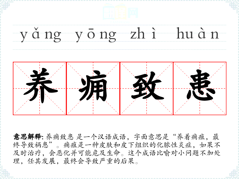 养痈致患 是一个汉语成语,字面意思是“养着痈疽,最终导致祸患”。痈疽是一种皮肤和皮下组织的化脓性炎症,如果不及时治疗,会恶化并可能危及生命。这个成语比喻对小问题不加处理,任其发展,最终会导致严重的后果。