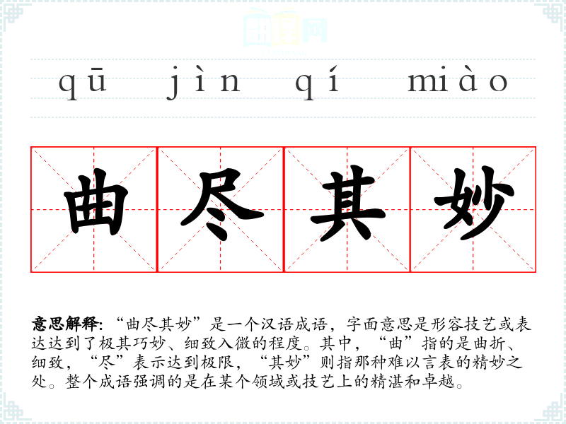 “曲尽其妙”是一个汉语成语,字面意思是形容技艺或表达达到了极其巧妙、细致入微的程度。其中,“曲”指的是曲折、细致,“尽”表示达到极限,“其妙”则指那种难以言表的精妙之处。整个成语强调的是在某个领域或技艺上的精湛和卓越。