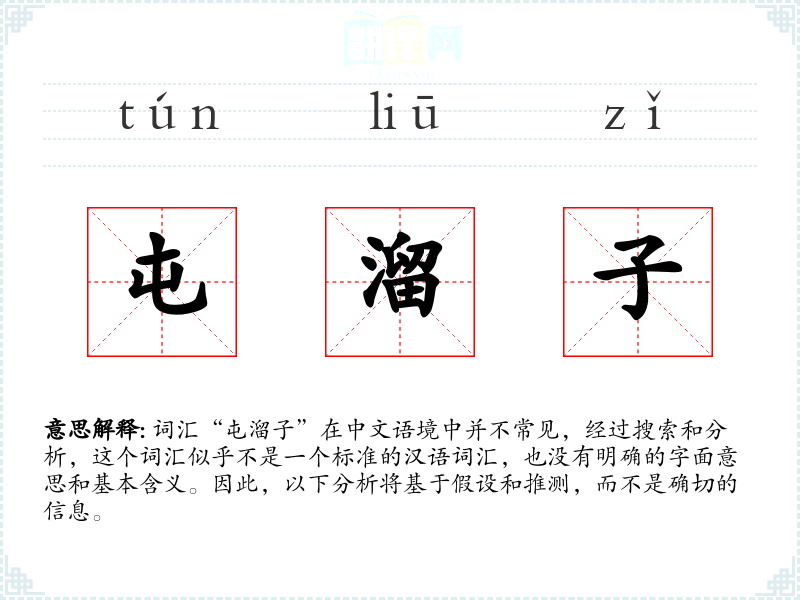 词汇“屯溜子”在中文语境中并不常见,经过搜索和分析,这个词汇似乎不是一个标准的汉语词汇,也没有明确的字面意思和基本含义。因此,以下分析将基于假设和推测,而不是确切的信息。