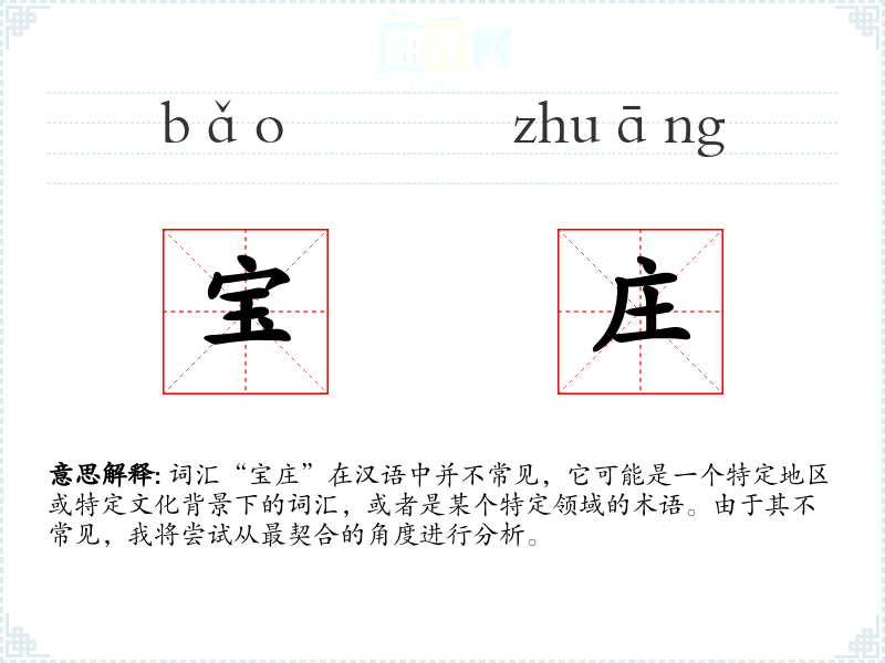 词汇“宝庄”在汉语中并不常见,它可能是一个特定地区或特定文化背景下的词汇,或者是某个特定领域的术语。由于其不常见,我将尝试从最契合的角度进行分析。