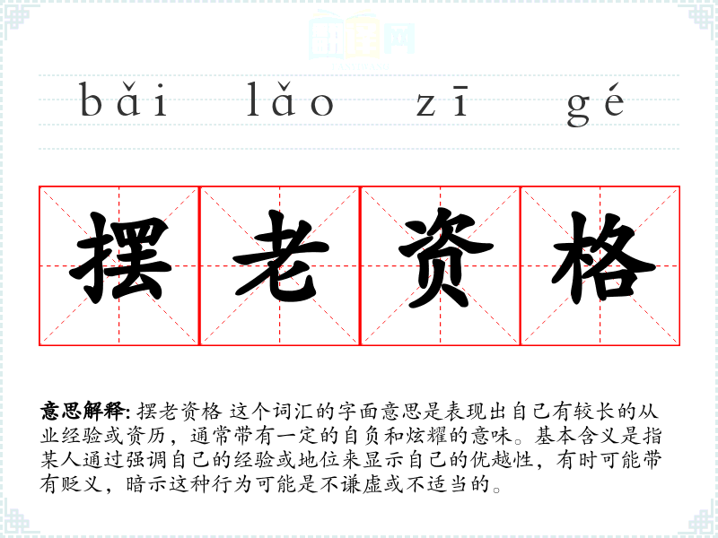 摆老资格 这个词汇的字面意思是表现出自己有较长的从业经验或资历,通常带有一定的自负和炫耀的意味。基本含义是指某人通过强调自己的经验或地位来显示自己的优越性,有时可能带有贬义,暗示这种行为可能是不谦虚或不适当的。