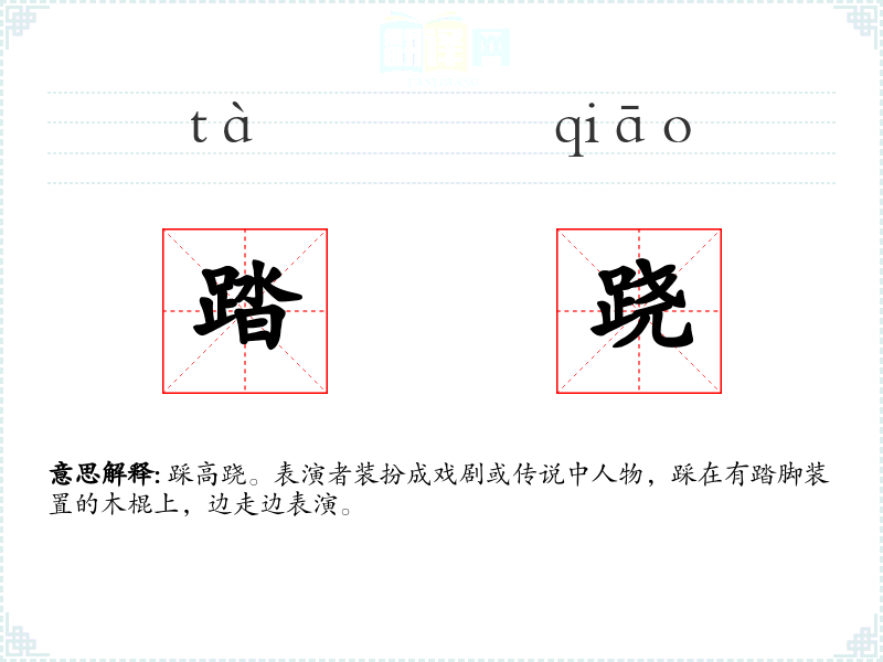 踩高跷。表演者装扮成戏剧或传说中人物,踩在有踏脚装置的木棍上,边走边表演。