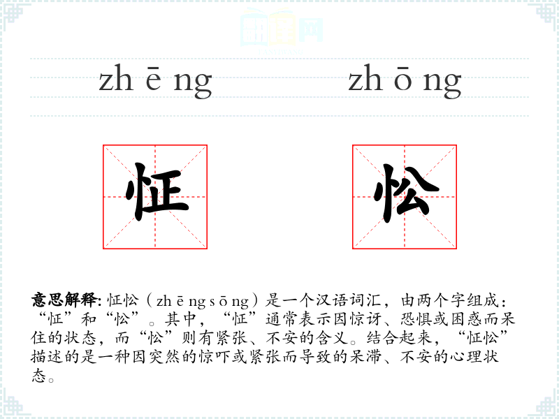 怔忪(zhēng sōng)是一个汉语词汇,由两个字组成:“怔”和“忪”。其中,“怔”通常表示因惊讶、恐惧或困惑而呆住的状态,而“忪”则有紧张、不安的含义。结合起来,“怔忪”描述的是一种因突然的惊吓或紧张而导致的呆滞、不安的心理状态。