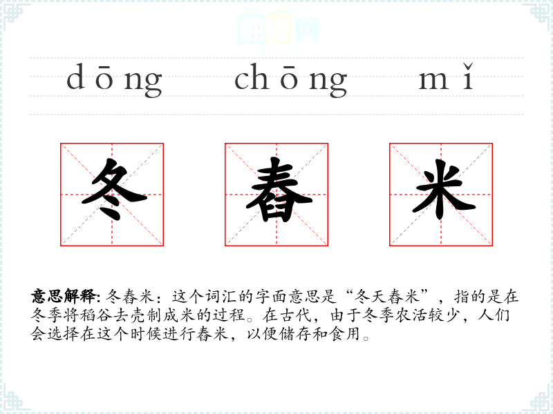 冬舂米:这个词汇的字面意思是“冬天舂米”,指的是在冬季将稻谷去壳制成米的过程。在古代,由于冬季农活较少,人们会选择在这个时候进行舂米,以便储存和食用。