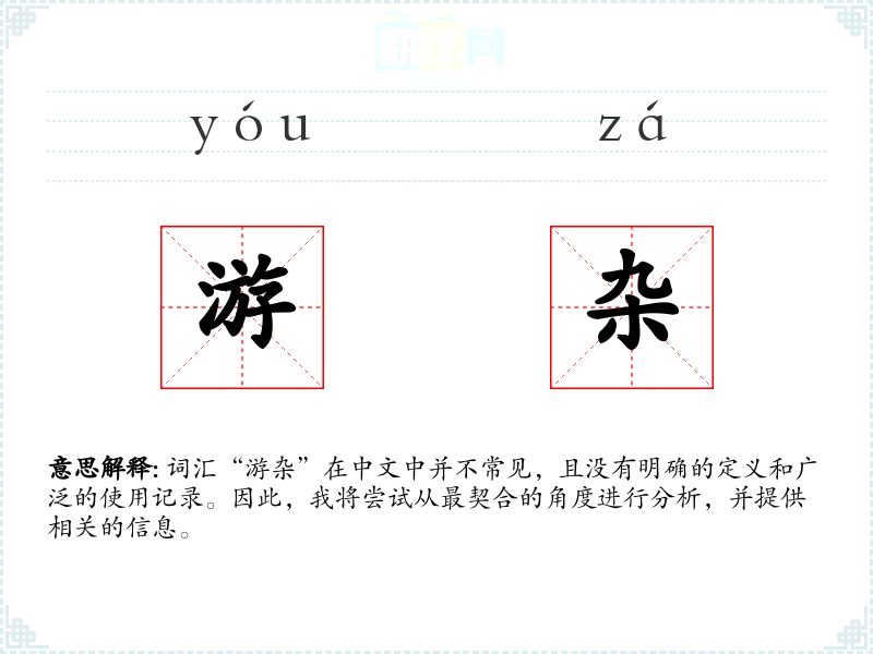 词汇“游杂”在中文中并不常见,且没有明确的定义和广泛的使用记录。因此,我将尝试从最契合的角度进行分析,并提供相关的信息。