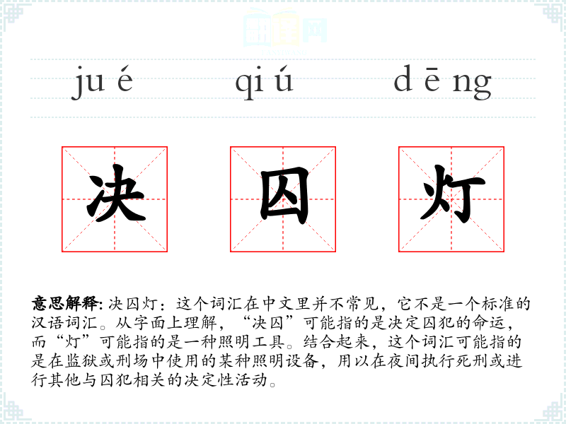 决囚灯:这个词汇在中文里并不常见,它不是一个标准的汉语词汇。从字面上理解,“决囚”可能指的是决定囚犯的命运,而“灯”可能指的是一种照明工具。结合起来,这个词汇可能指的是在监狱或刑场中使用的某种照明设备,用以在夜间执行死刑或进行其他与囚犯相关的决定性活动。