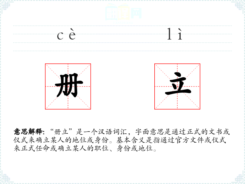 “册立”是一个汉语词汇,字面意思是通过正式的文书或仪式来确立某人的地位或身份。基本含义是指通过官方文件或仪式来正式任命或确立某人的职位、身份或地位。