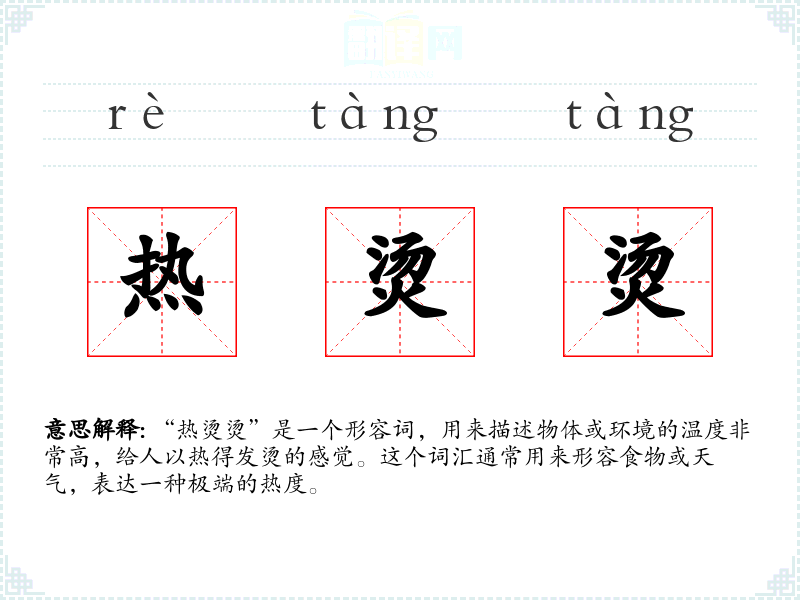 “热烫烫”是一个形容词,用来描述物体或环境的温度非常高,给人以热得发烫的感觉。这个词汇通常用来形容食物或天气,表达一种极端的热度。