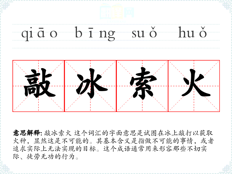 敲冰索火 这个词汇的字面意思是试图在冰上敲打以获取火种,显然这是不可能的。其基本含义是指做不可能的事情,或者追求实际上无法实现的目标。这个成语通常用来形容那些不切实际、徒劳无功的行为。