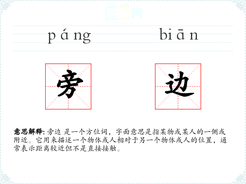 旁边 是一个方位词,字面意思是指某物或某人的一侧或附近。它用来描述一个物体或人相对于另一个物体或人的位置,通常表示距离较近但不是直接接触。