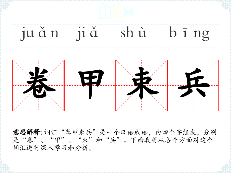 词汇“卷甲束兵”是一个汉语成语,由四个字组成,分别是“卷”、“甲”、“束”和“兵”。下面我将从各个方面对这个词汇进行深入学*和分析。