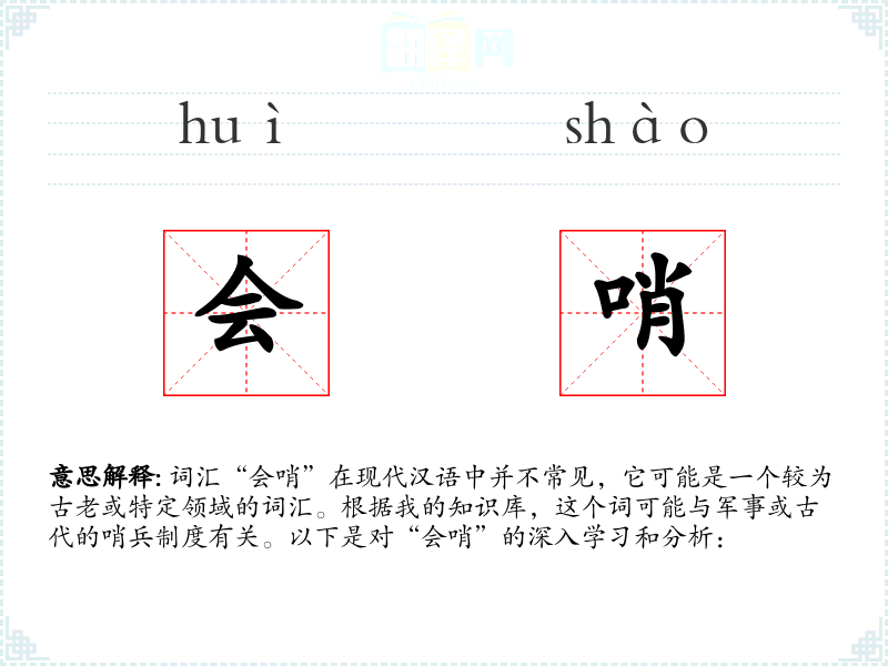 词汇“会哨”在现代汉语中并不常见,它可能是一个较为古老或特定领域的词汇。根据我的知识库,这个词可能与军事或古代的哨兵制度有关。以下是对“会哨”的深入学*和分析: