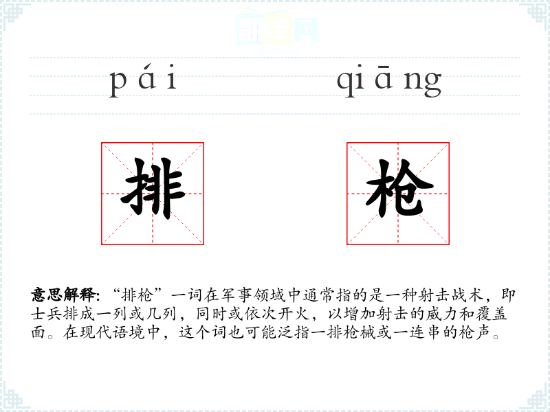 - 口语:在日常口语中,“排枪”可能被用来形容连续不断的声音或动作,如“掌声如排枪般响起”。