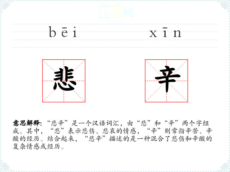 “悲辛”作为一个复合词,其字面意义直接来源于“悲”和“辛”的结合。在古代汉语中,“悲”和“辛”各自都有悠久的使用历史,而“悲辛”作为一个固定搭配,可能是在长期的语言使用中逐渐形成的。
