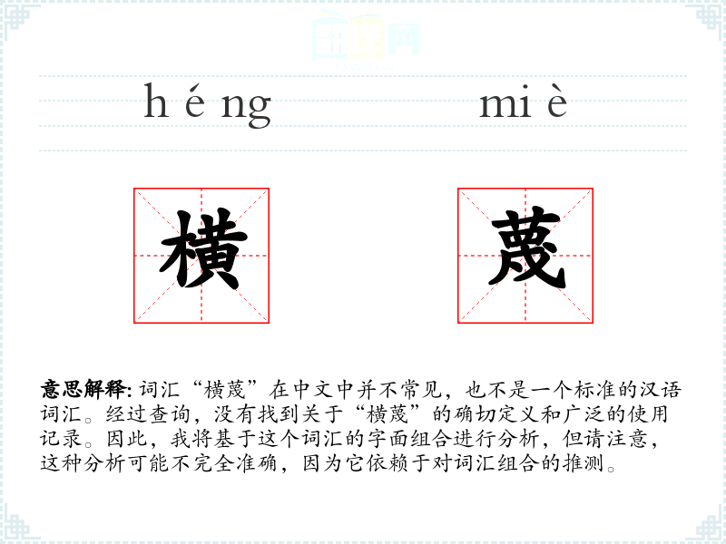 词汇“横蔑”在中文中并不常见,也不是一个标准的汉语词汇。经过查询,没有找到关于“横蔑”的确切定义和广泛的使用记录。因此,我将基于这个词汇的字面组合进行分析,但请注意,这种分析可能不完全准确,因为它依赖于对词汇组合的推测。