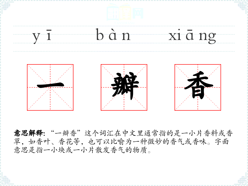 - 反义词:臭气、异味(这些词与“一瓣香”形成鲜明对比,表示不愉快的气味)