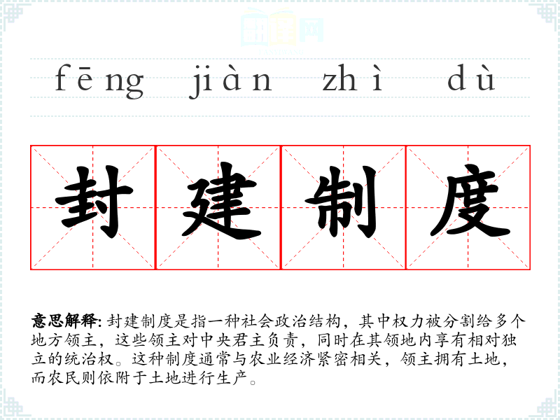 封建制度是指一种社会政治结构,其中权力被分割给多个地方领主,这些领主对中央君主负责,同时在其领地内享有相对独立的统治权。这种制度通常与农业经济紧密相关,领主拥有土地,而农民则依附于土地进行生产。