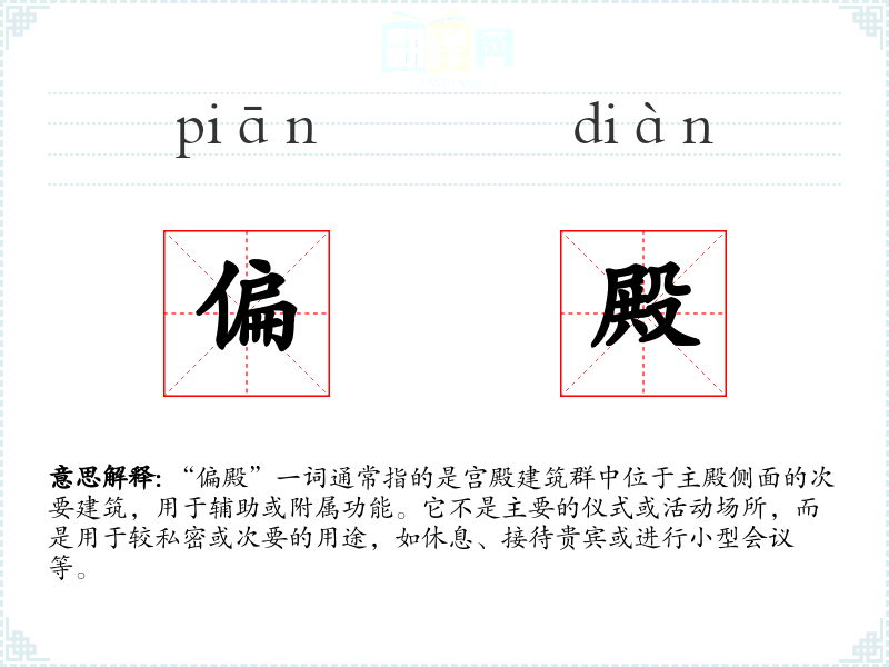 “偏殿”一词通常指的是宫殿建筑群中位于主殿侧面的次要建筑,用于辅助或附属功能。它不是主要的仪式或活动场所,而是用于较私密或次要的用途,如休息、接待贵宾或进行小型会议等。