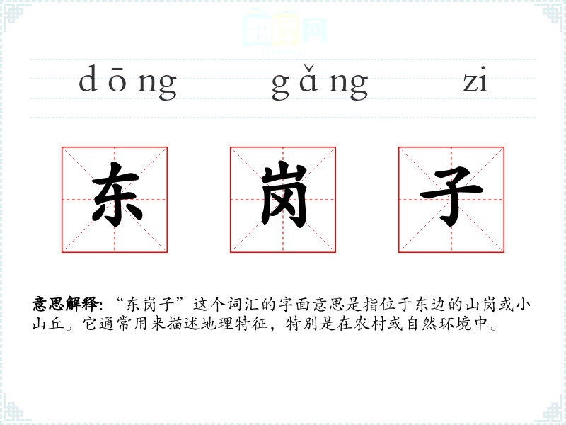 “东岗子”这个词汇的字面意思是指位于东边的山岗或小山丘。它通常用来描述地理特征,特别是在农村或自然环境中。