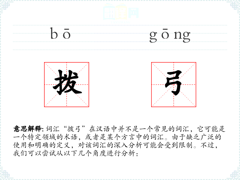 由于“拨弓”不是一个标准汉语词汇,我们无法提供一个确切的基本定义。它可能是指某种工具或动作,但具体含义需要更多的上下文信息。