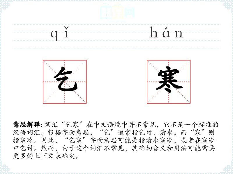 由于“乞寒”不是一个常用词汇,其词源和历史演变不详。它可能是由“乞”和“寒”两个字组合而成的新词,用于特定语境或文学创作。