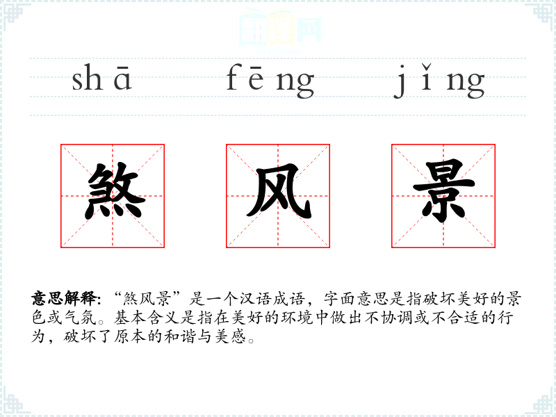 “煞风景”是一个汉语成语,字面意思是指破坏美好的景色或气氛。基本含义是指在美好的环境中做出不协调或不合适的行为,破坏了原本的和谐与美感。