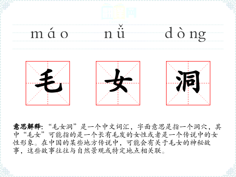 关于“毛女洞”的具体词源可能需要查阅地方志或民间传说资料,因为它可能与特定地区的文化传统紧密相关。随着时间的推移,这个词汇可能会有不同的解释和演变。