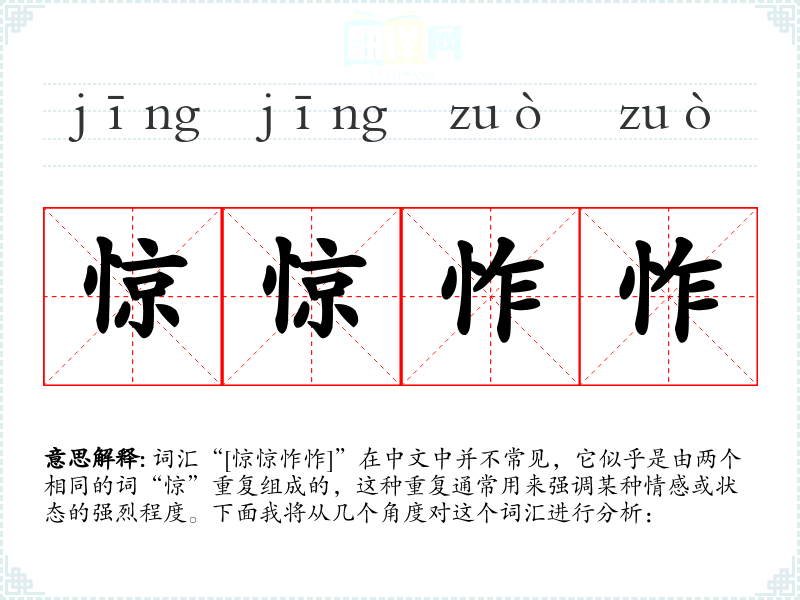 词汇“[惊惊怍怍]”在中文中并不常见,它似乎是由两个相同的词“惊”重复组成的,这种重复通常用来强调某种情感或状态的强烈程度。下面我将从几个角度对这个词汇进行分析: