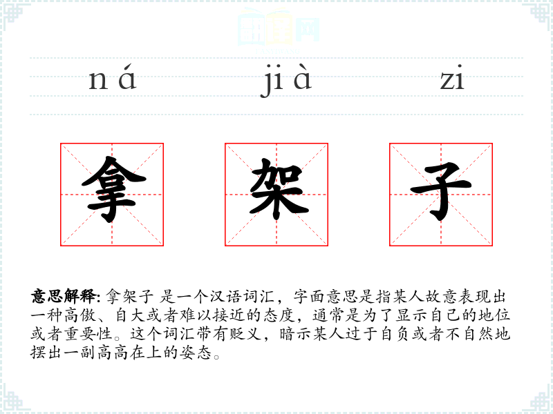 拿架子 是一个汉语词汇,字面意思是指某人故意表现出一种高傲、自大或者难以接近的态度,通常是为了显示自己的地位或者重要性。这个词汇带有贬义,暗示某人过于自负或者不自然地摆出一副高高在上的姿态。