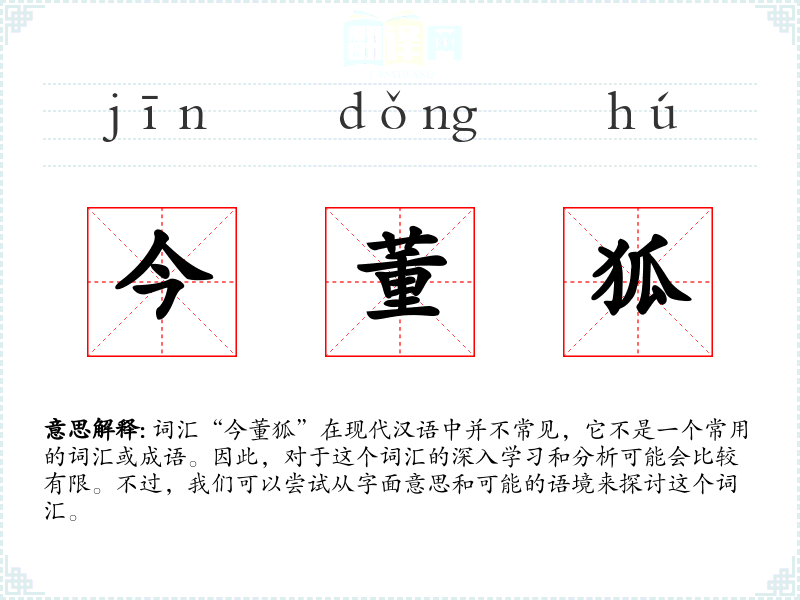 “今董狐”字面意思可能指的是“现在的董狐”。其中,“董狐”可能是指某个特定的人名或地名,但这个词汇在现代汉语中并不常见,因此很难给出一个确切的基本含义。
