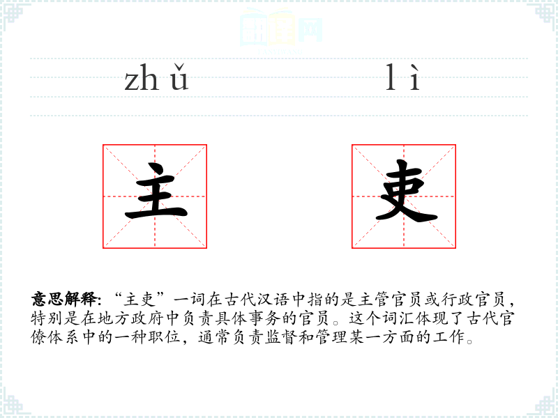 “主吏”一词的词源可以追溯到古代汉语,其中“主”表示主管或负责人,“吏”则指官员或公务员。随着时间的推移,这个词汇的使用逐渐减少,现代汉语中更多使用“官员”等更为通用的词汇。