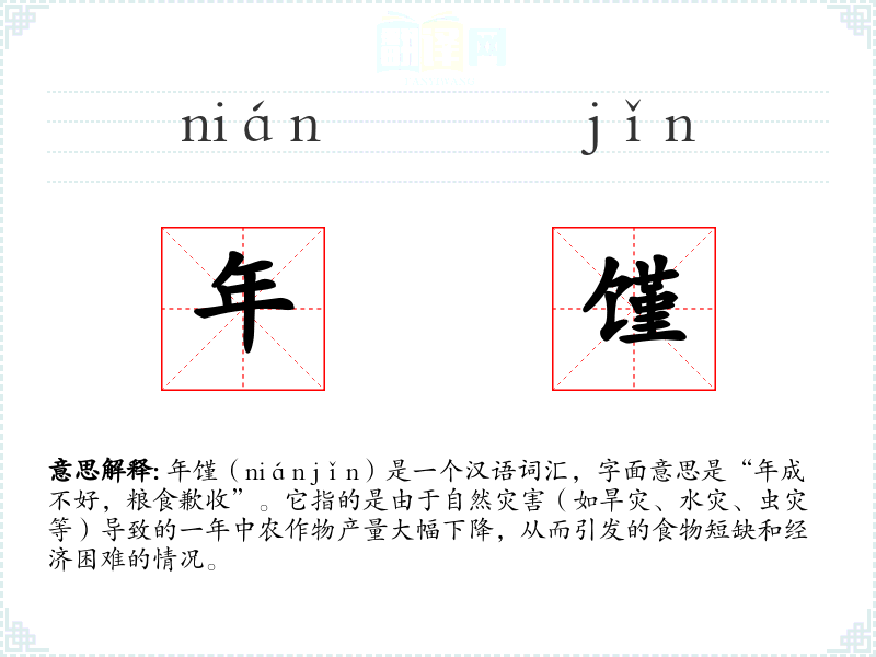 年馑(nián jǐn)是一个汉语词汇,字面意思是“年成不好,粮食歉收”。它指的是由于自然灾害(如旱灾、水灾、虫灾等)导致的一年中农作物产量大幅下降,从而引发的食物短缺和经济困难的情况。